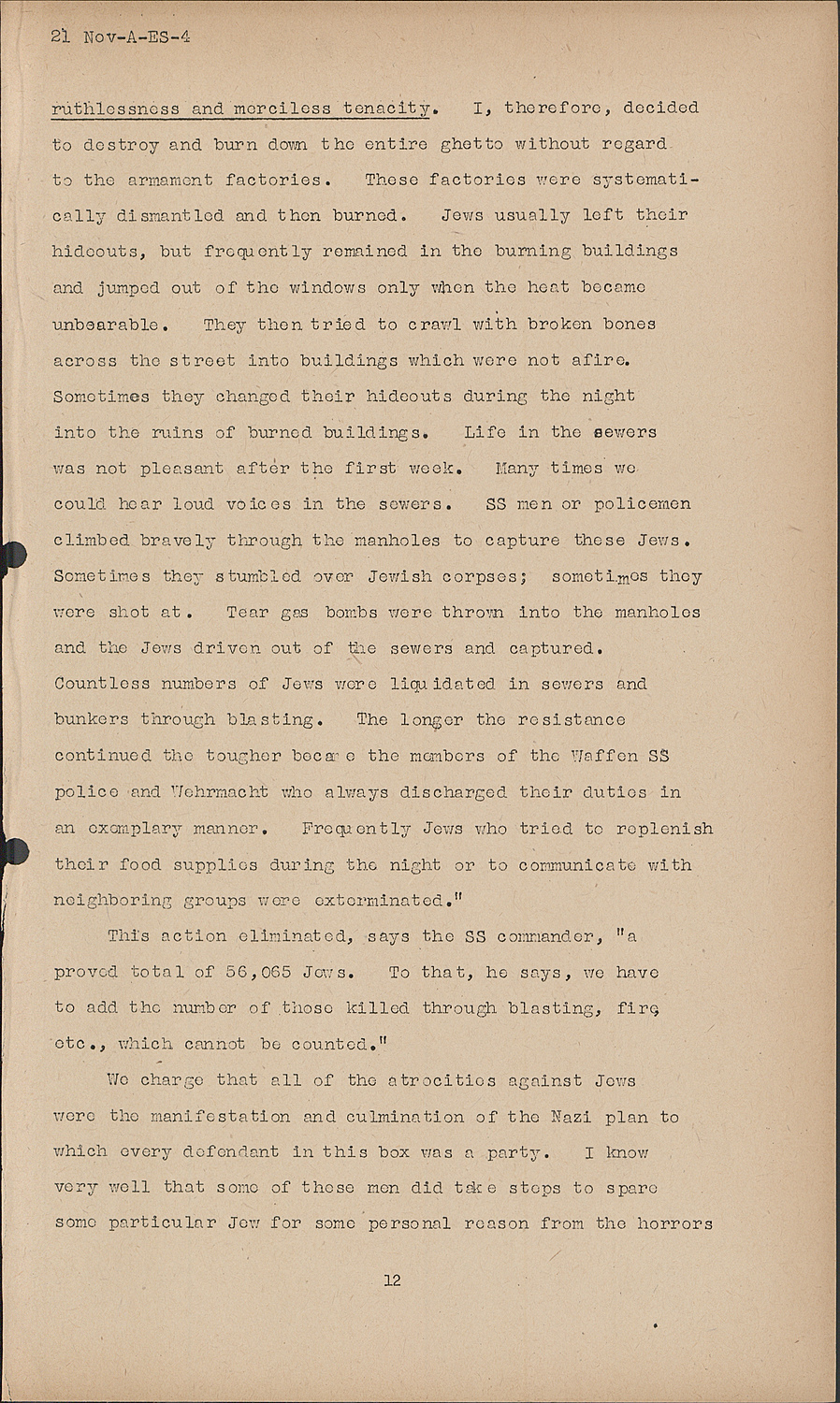 I shall not dwell on this subject longer than to quote one more sickening document which evidences the planned and systematic character of these Jewish persecutions. I hold an original report written with Teutonic thoroughness as to detail, illustrated with photographs to authenticate its almost incredible text, and beautifully bound in leather with the loving care bestowed to a proud work. It is the original report of the SS Brigade General Stroop in charge of the destruction of the Warsaw Ghetto, and Hans Frank was Governor General of Poland. Its title page carries the inscription, "The Jewish Ghetto in Warsaw no longer exists."