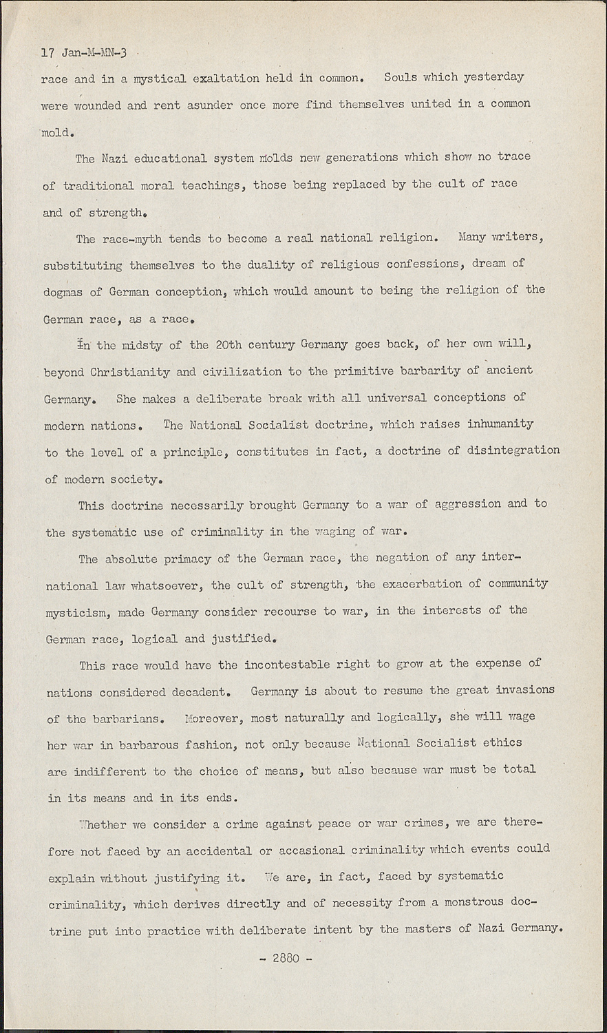 Whether we consider a crime against peace or war crimes, we are therefore not faced by an accidental or accasional criminality which events could explain without justifying it. We are, in fact, faced by systematic criminality, which derives directly and of necessity from a monstrous doctrine put into practice with deliberate intent by the masters of Nazi Germany.