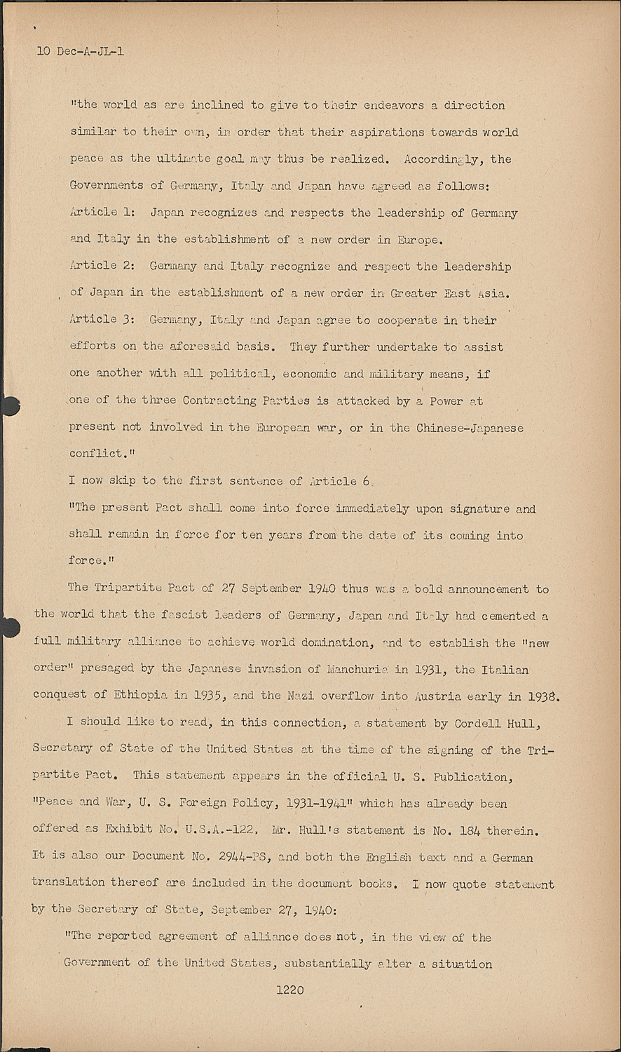 I should like to read, in this connection, a statement by Cordell Hull, Secretary of State of the United States at the time of the signing of the Tripartite Pact. This statement appears in the official U. S. Publication, "Peace and War, U. S. Foreign Policy, 1931-1941" which has already been offered as Exhibit No. U.S.A.-122. Mr. Hull's statement is No. 184 therein. It is also our Document No. 2944-PS, and both the English text and a German translation thereof are included in the document books. I now quote statement by the Secretary of State, September 27, 1940: