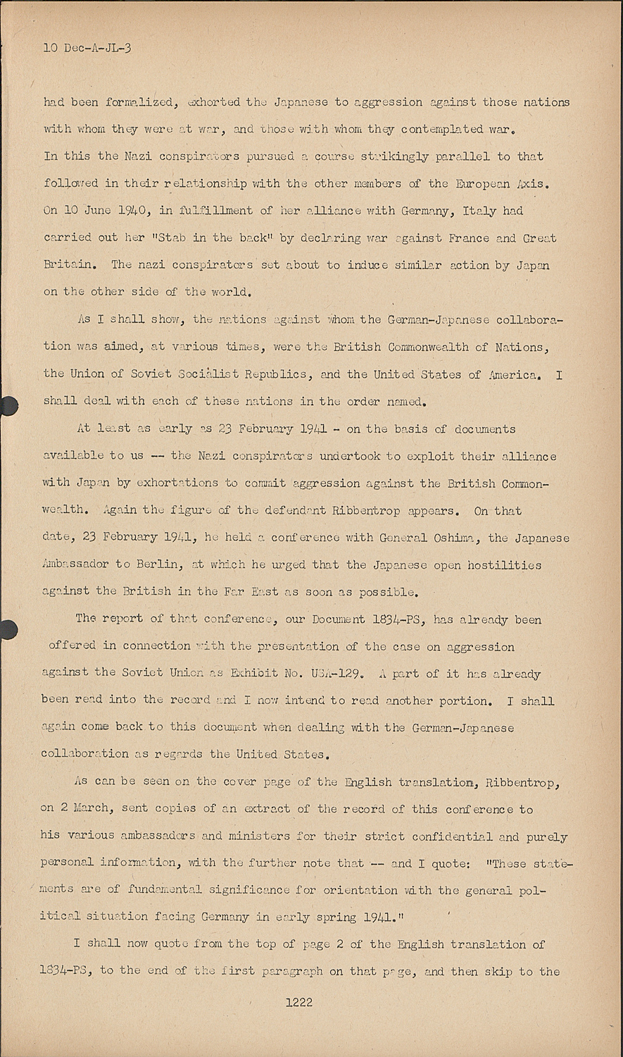 At least as early as 23 February 1941 - on the basis of documents available to us -- the Nazi conspirators undertook to exploit their alliance with Japan by exhortations to commit aggression against the British Commonwealth. Again the figure of the defendant Ribbentrop appears. On that date, 23 February 1941, he held a conference with General Oshima, the Japanese Ambassador to Berlin, at which he urged that the Japanese open hostilities against the British in the Far East as soon as possible.