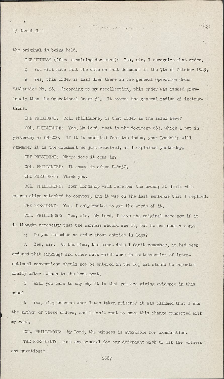 AAt these briefing sessions I read this radio message to the commanders without any commentary. In some few instances commanders have inquired of me what the order meant. In such cases I gave the commander the lead inquiry. I have read to him the two examples. However, I pointed out that the Flag Officer U-boat could not officially give him such an order, and that he had to act according to his own conscience.